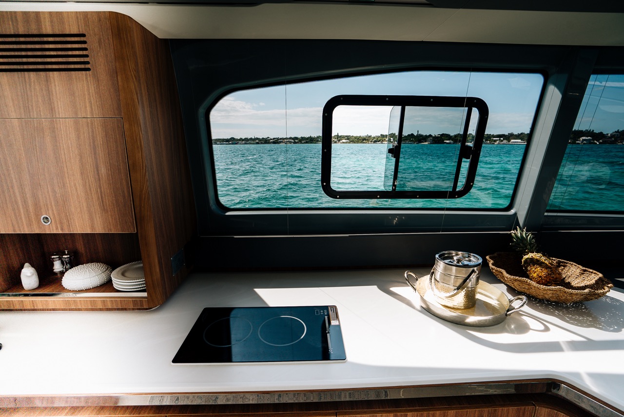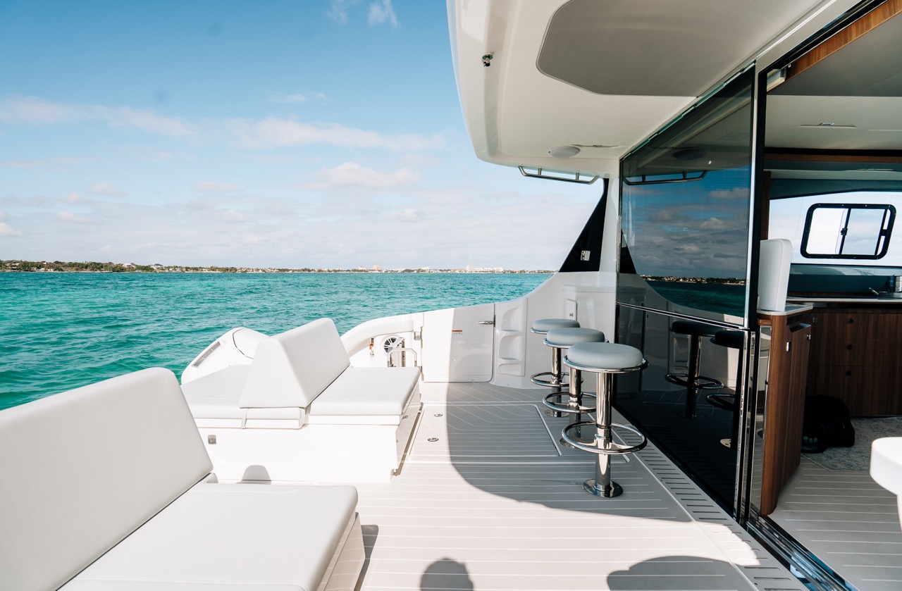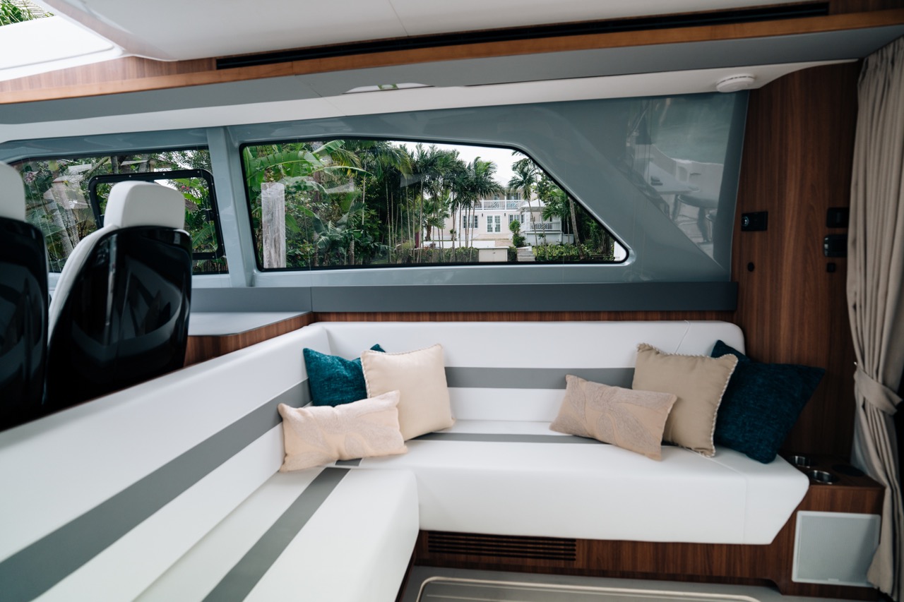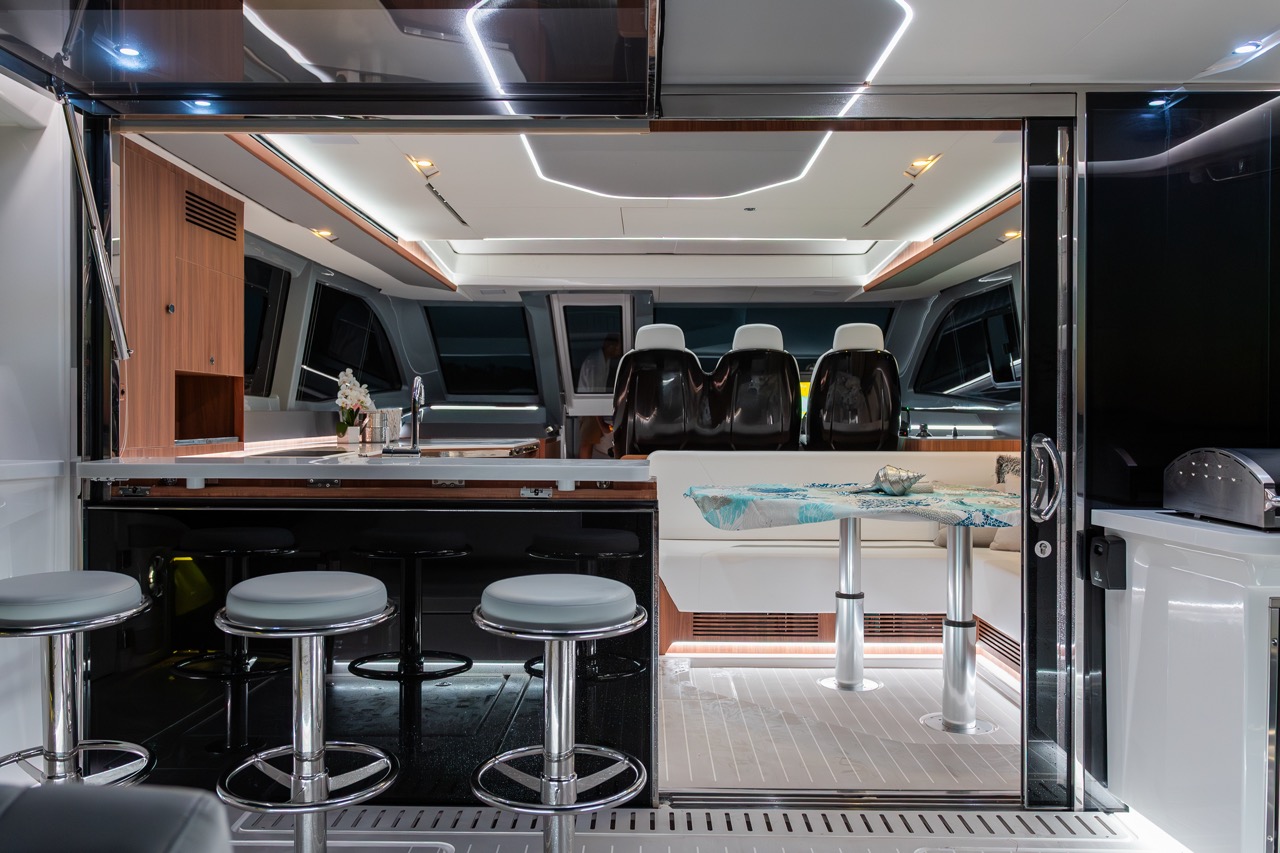 Its innovative layout transitions seamlessly from open-air enjoyment to a fully enclosed retreat. Wide decks and thoughtfully appointed interiors create luxurious living spaces, while social areas like the cockpit bar window and sheltered bow lounge make hosting effortless.