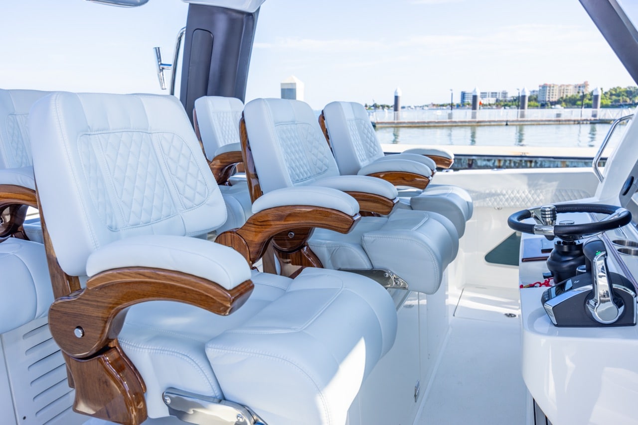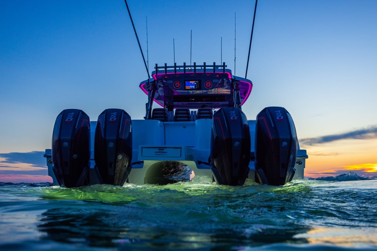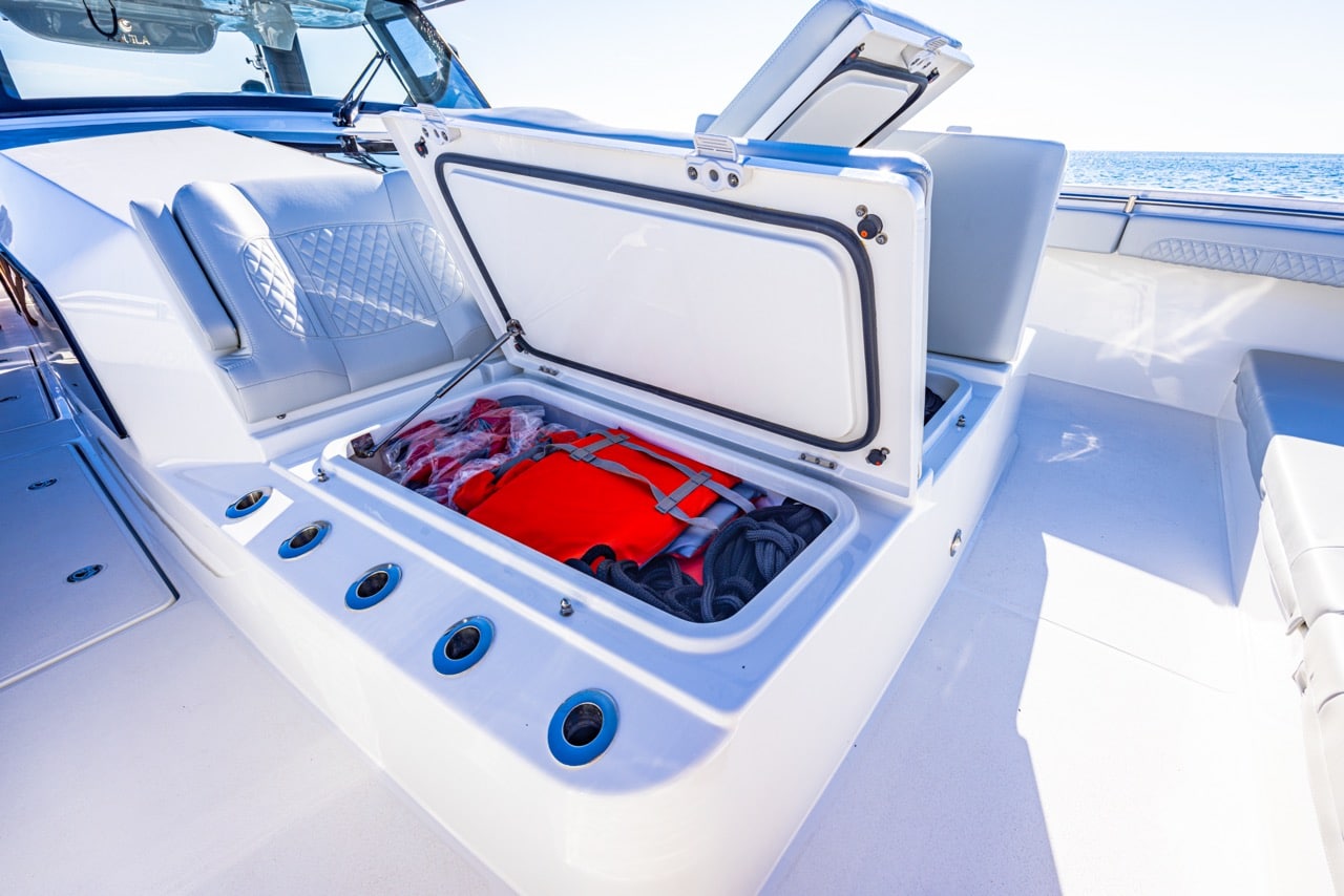 From bow to stern, every detail supports serious fishing: 360-degree walk-around access, twin 42-gallon livewells, and over 700 gallons of fishbox capacity. When the rods are down, the expansive deck transforms into a luxury cruising space with seating for up to 17 people and an optional summer kitchen for effortless entertaining.