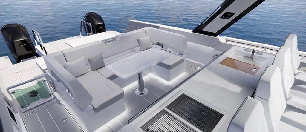 O coração do iate é o amplo cockpit traseiro, concebido como uma verdadeira plataforma de entretenimento. Os guardas rebatíveis em ambos os lados aumentam significativamente a área do convés, criando uma ligação perfeita com o mar. Os assentos moduláveis transformam-se facilmente de espaço de refeições em zona de sol, enquanto características como escada de banho integrada e a opção de cozinha com barbecue, garantem momentos de lazer sem esforço ao longo do dia.