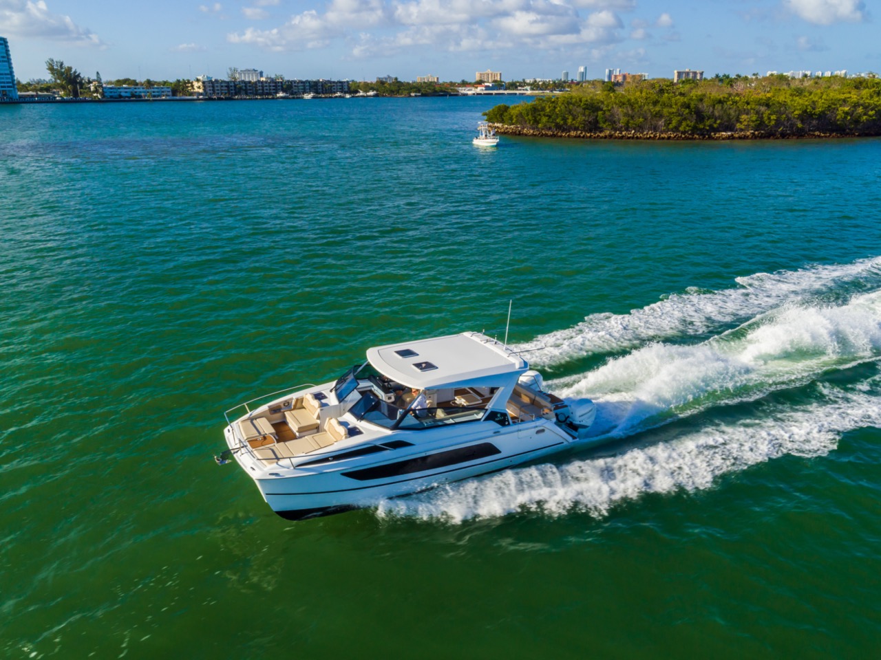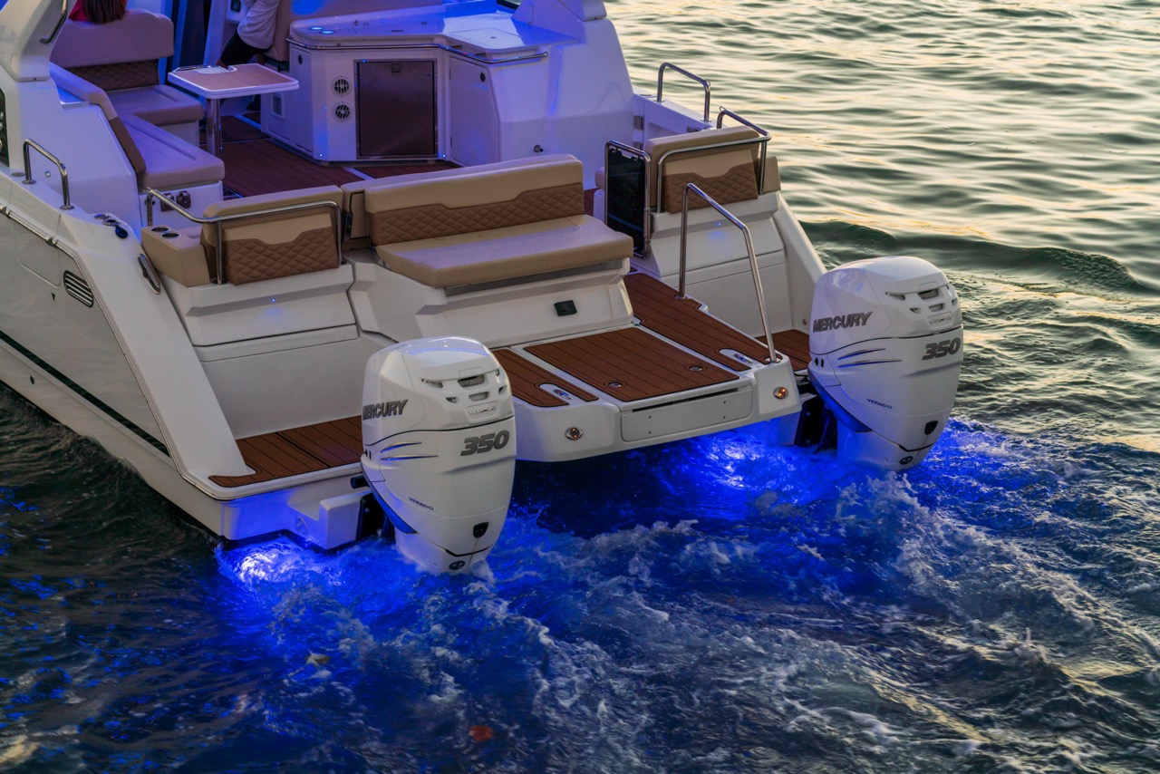 Equipado com dois motores Mercury Verado de 300 HP e joystick de comando, o 36 Sport garante resposta rápida e controlo preciso. O sistema opcional Aquila Hydro Glide® melhora a eficiência, aumentando a economia de combustível até 40% sem comprometer velocidade ou estabilidade.