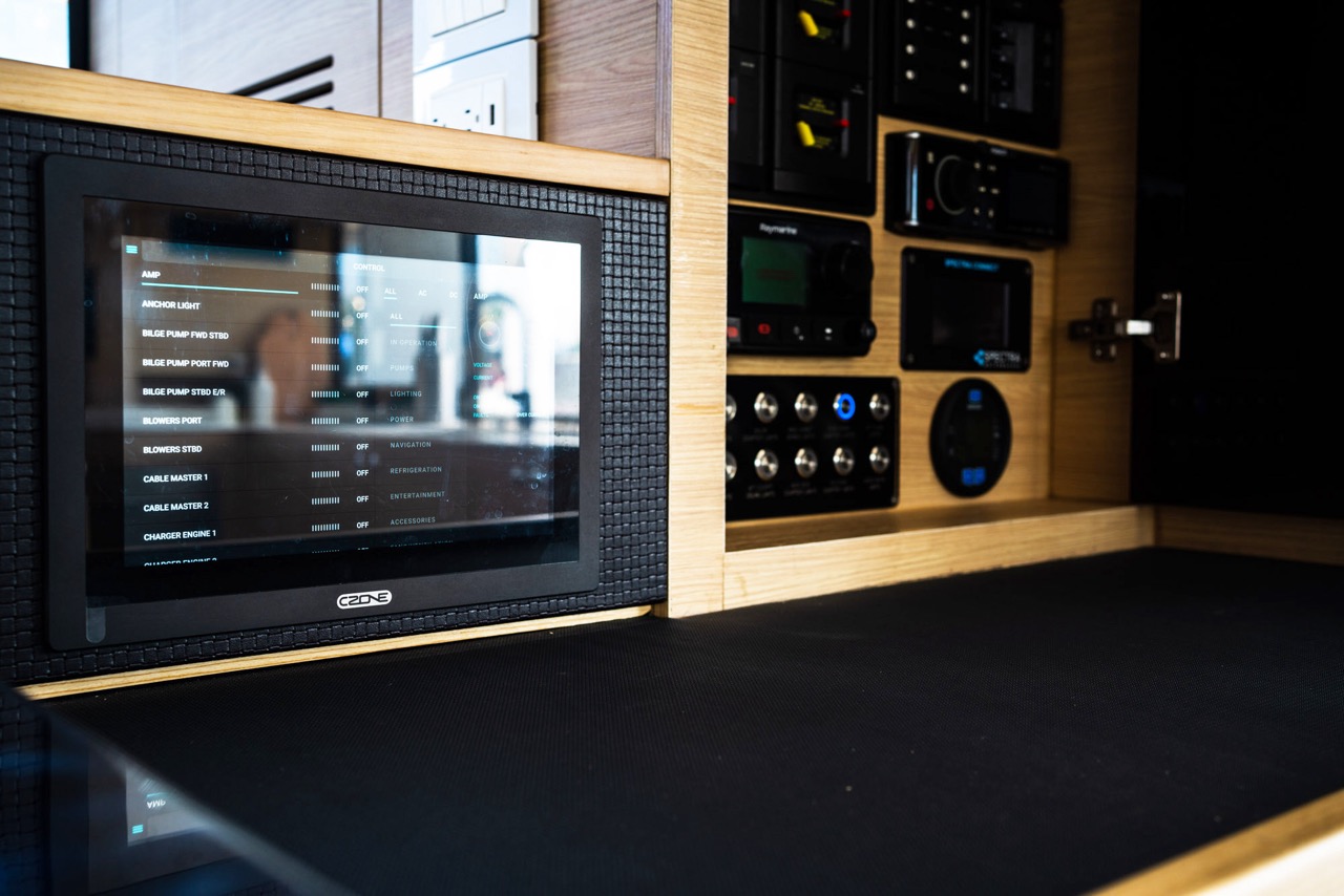 Com uma boca impressionante de 7,68 metros, este iate oferece estabilidade incomparável. O salão panorâmico, completo com frigorífico de tamanho completo e portas deslizantes amplas, integra-se de forma fluida com o cockpit expansivo, enquanto o flybridge proporciona um espaço social elevado, com múltiplas áreas de assentos e um wet bar.