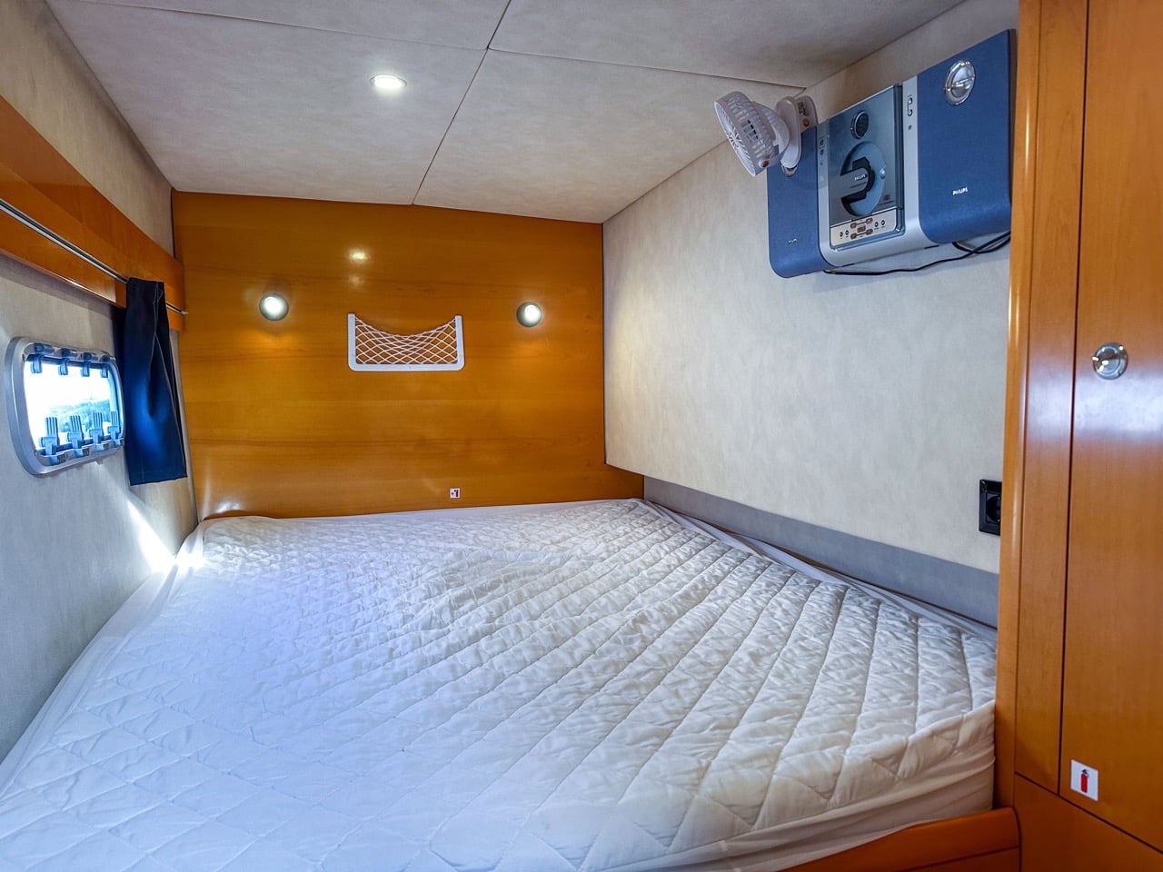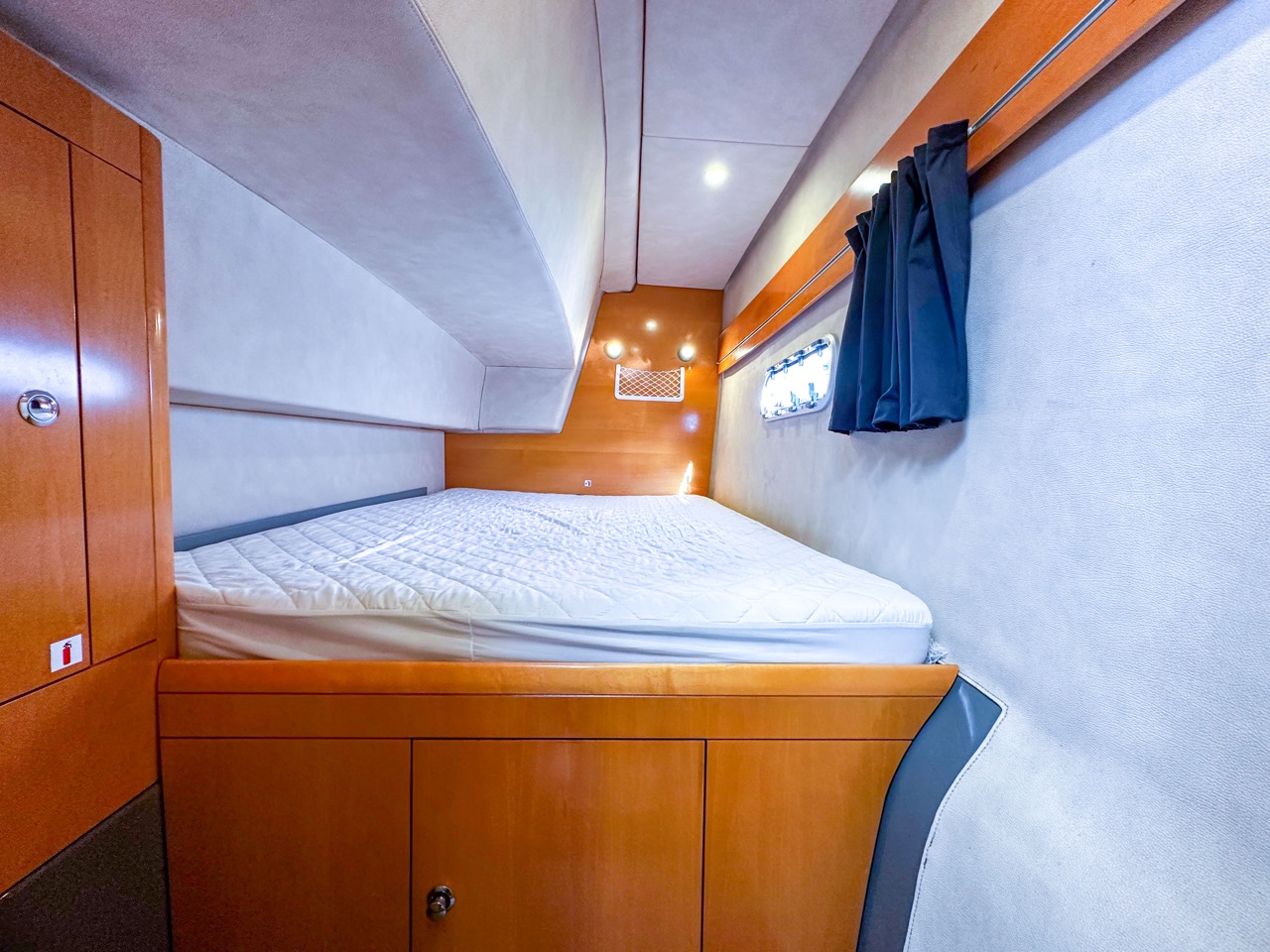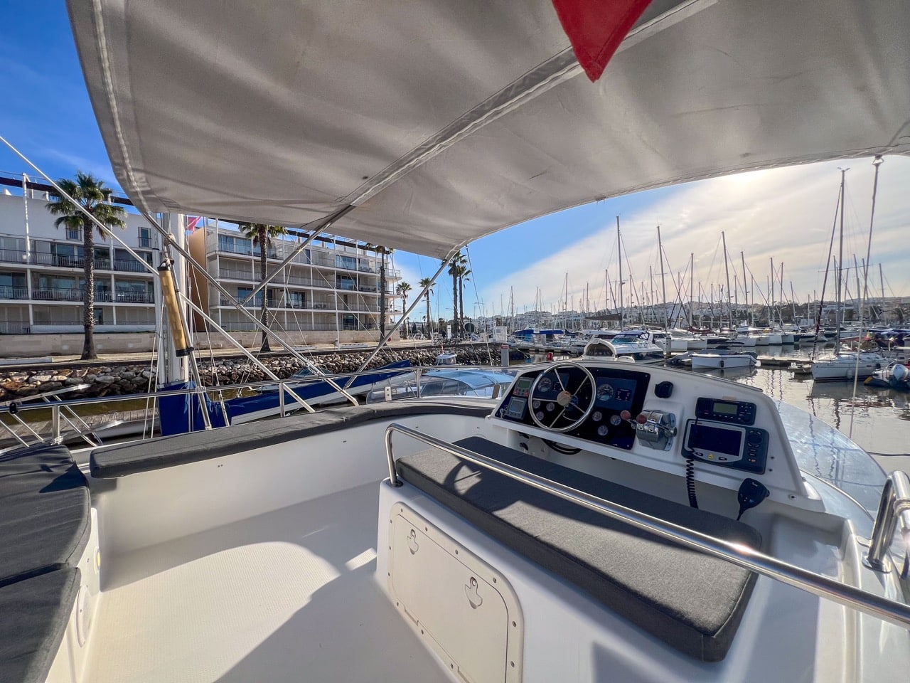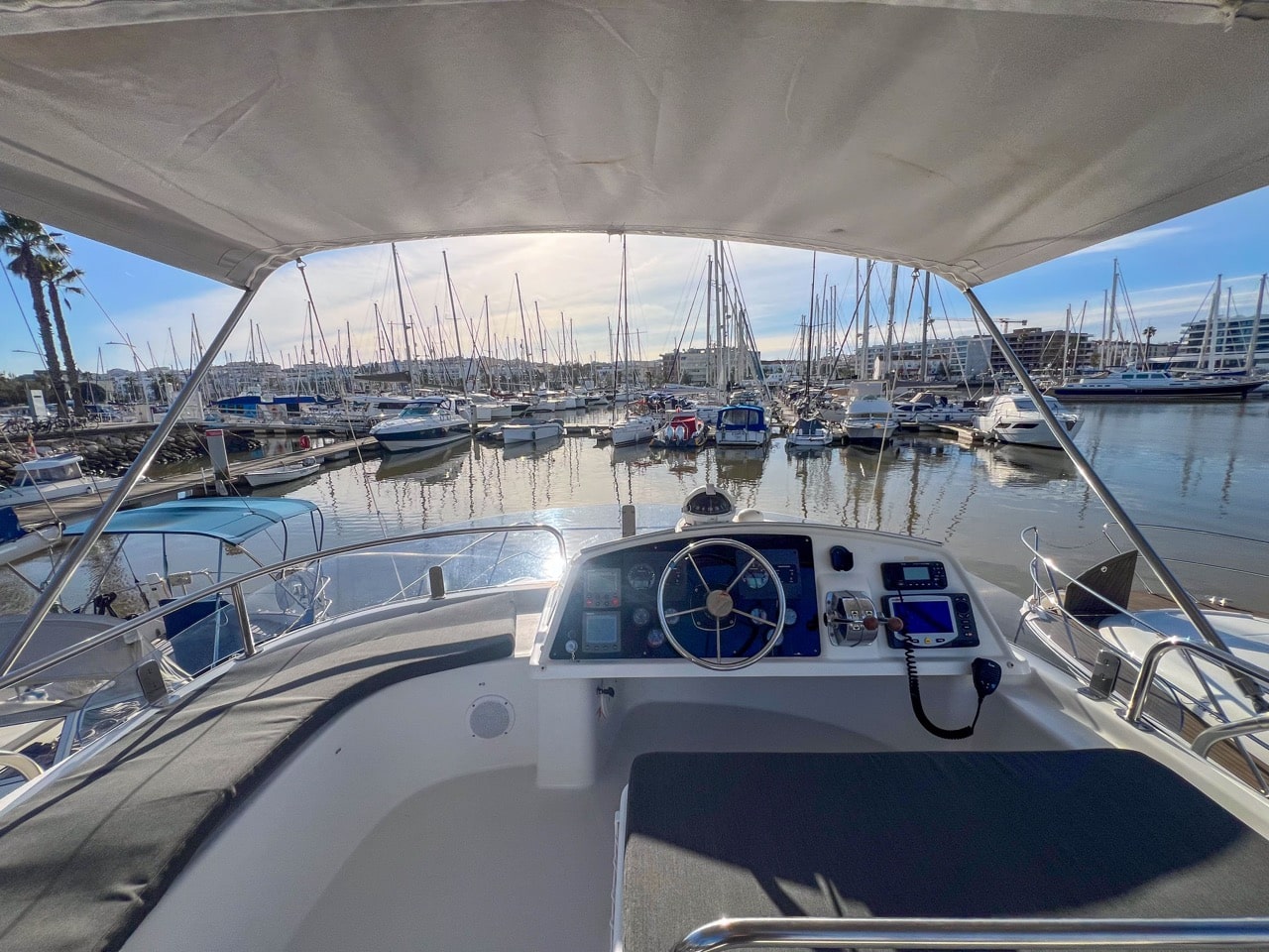 Os espaços exteriores foram concebidos para o prazer no mar, com um cockpit espaçoso, assentos no flybridge e toldo na popa, perfeitos para refeições ao ar livre ou relaxar no convés. No interior, almofadas renovadas, iluminação moderna e tecidos novos criam um ambiente acolhedor, enquanto equipamentos essenciais como piloto automático, sistema de áudio marítimo e navegação Raymarine oferecem total confiança em cada viagem.