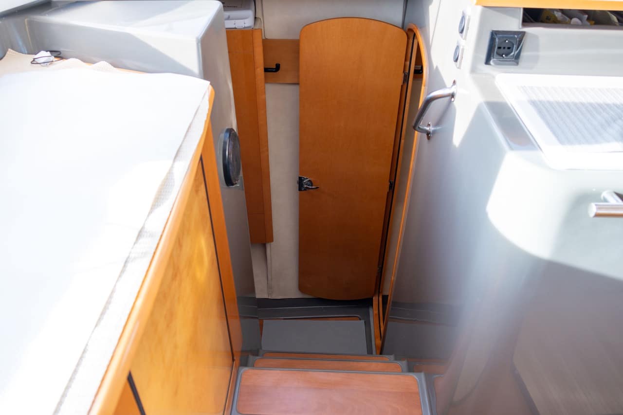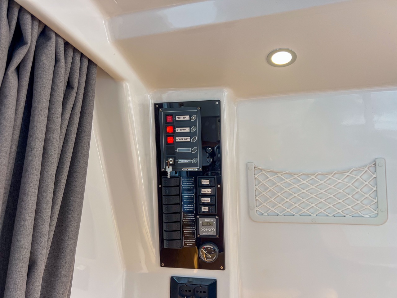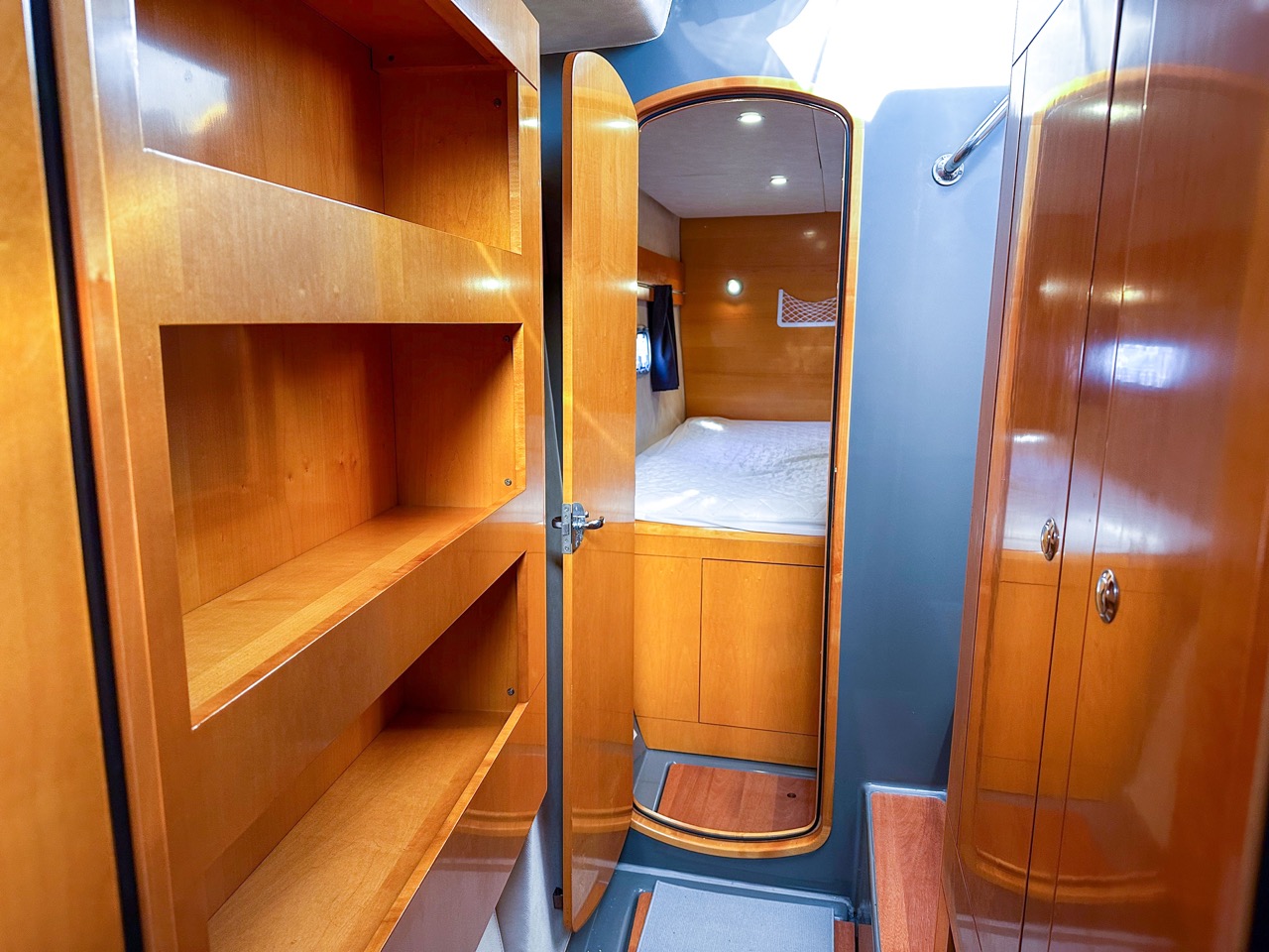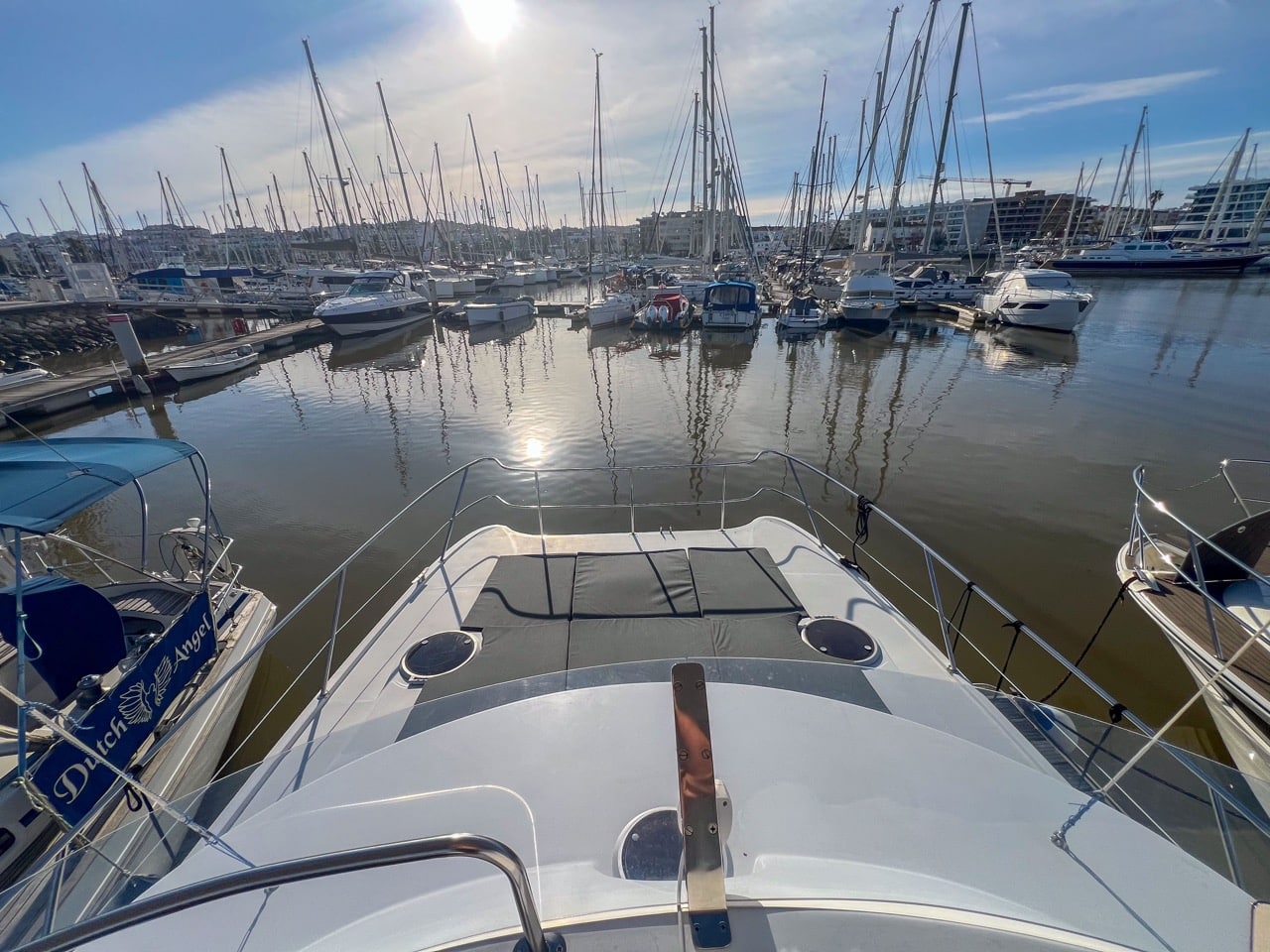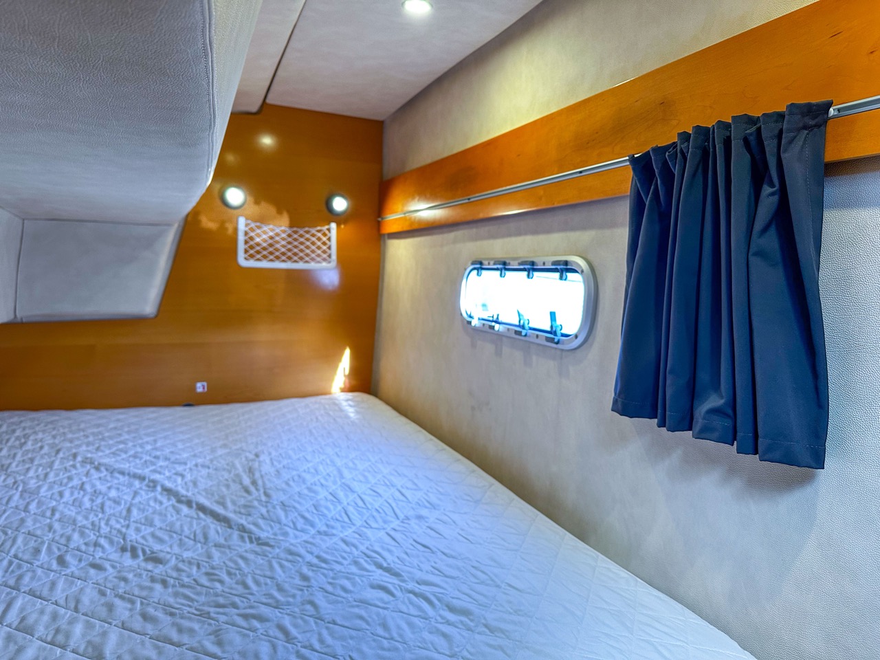 Os espaços exteriores foram concebidos para o prazer no mar, com um cockpit espaçoso, assentos no flybridge e toldo na popa, perfeitos para refeições ao ar livre ou relaxar no convés. No interior, almofadas renovadas, iluminação moderna e tecidos novos criam um ambiente acolhedor, enquanto equipamentos essenciais como piloto automático, sistema de áudio marítimo e navegação Raymarine oferecem total confiança em cada viagem.