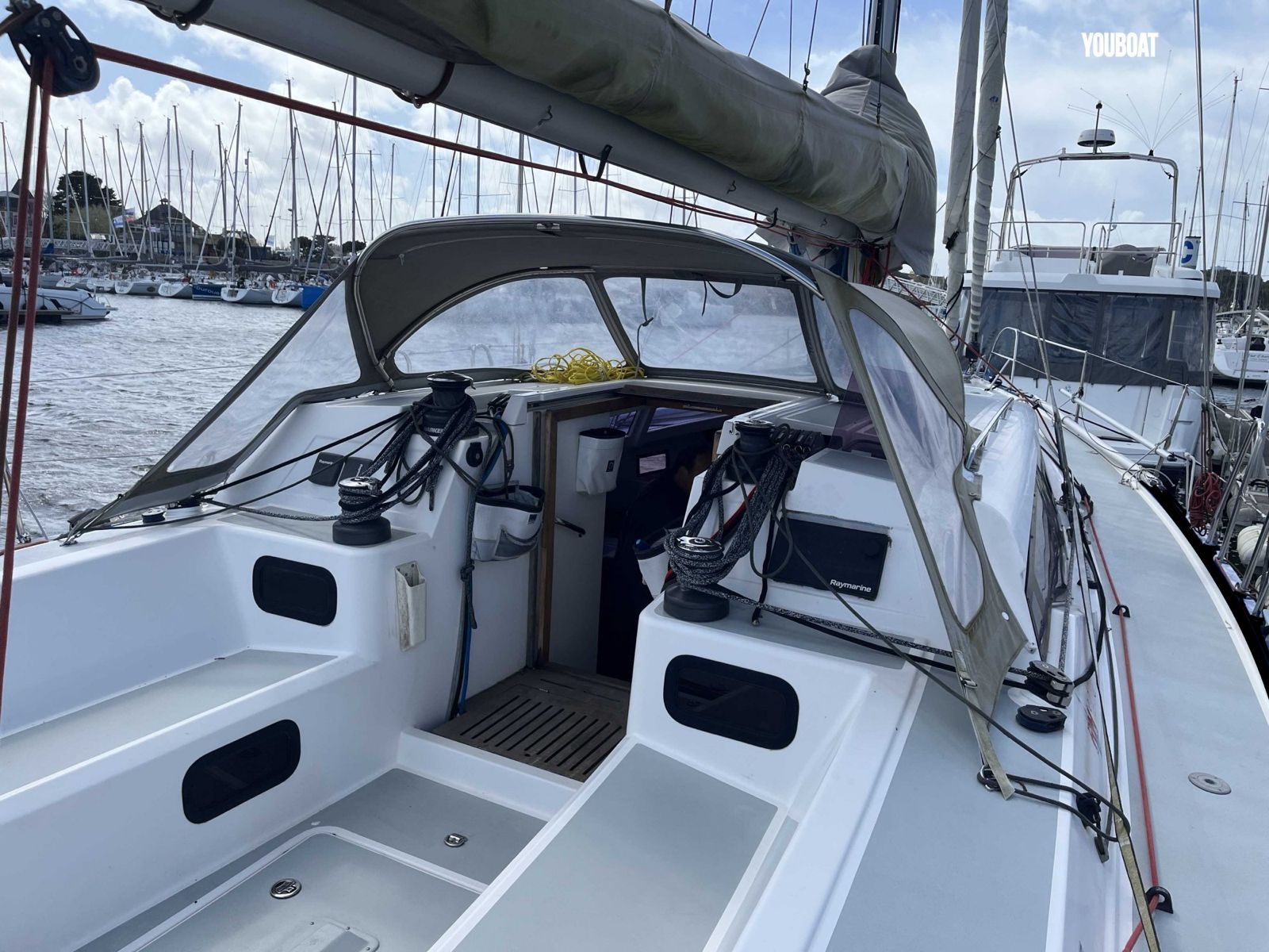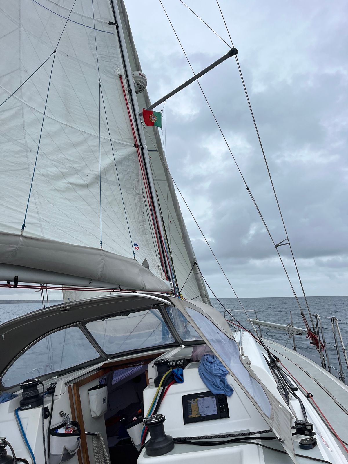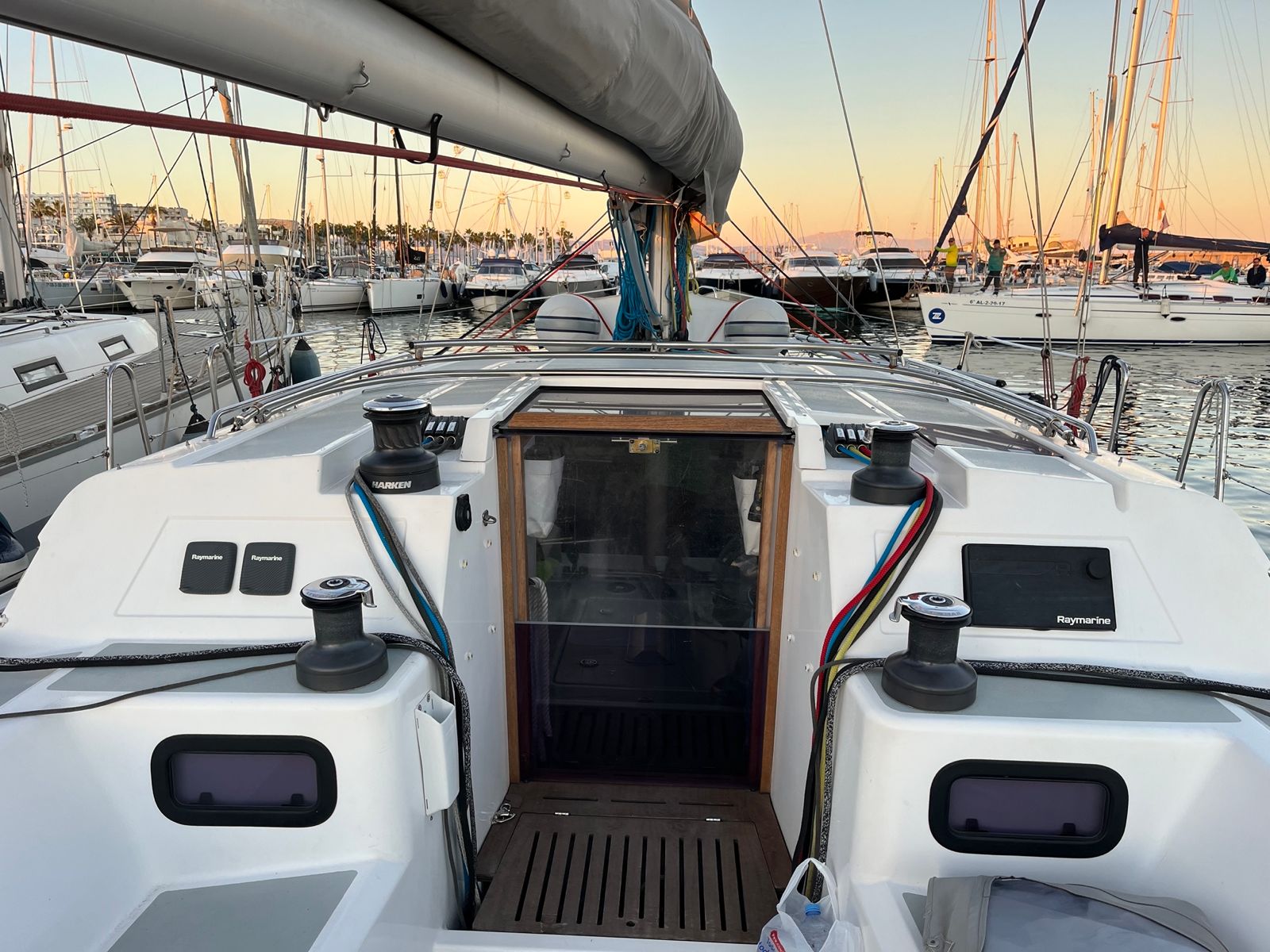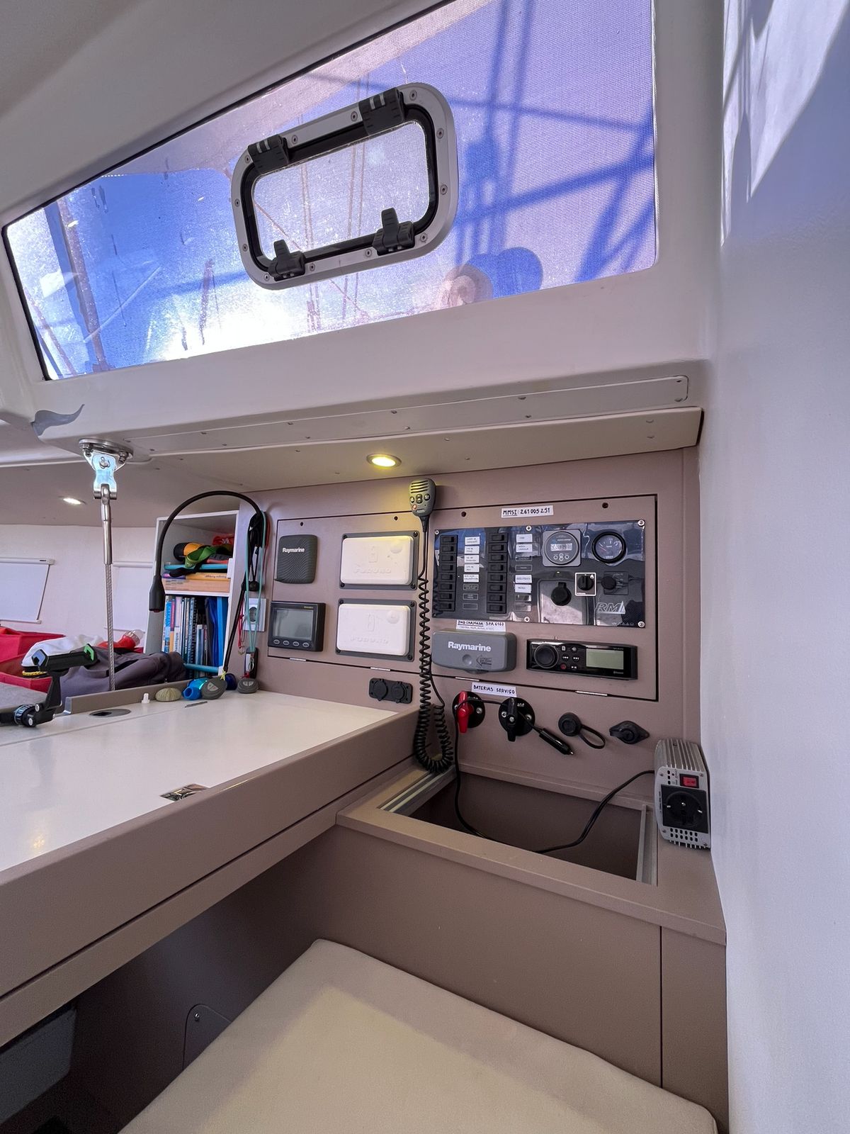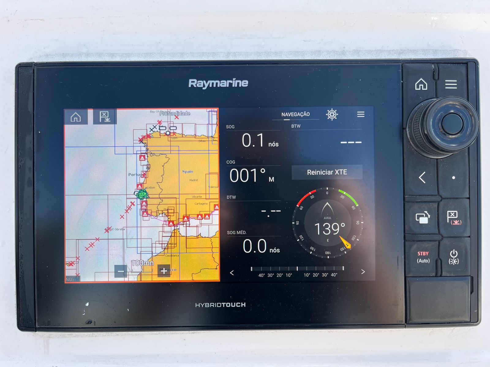 A eletrónica e o controlo estão ao mesmo nível: piloto automático Raymarine EV400 Sail, plotter Raymarine Axiom 9 (2019), transceiver AIS Classe B, radar, Navtex e EPIRB.