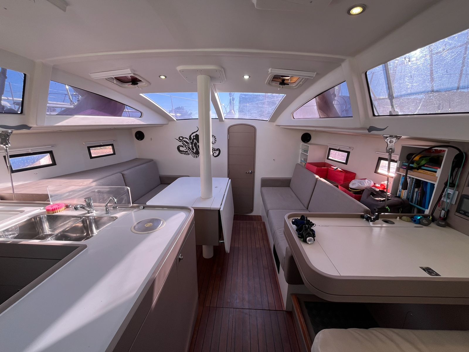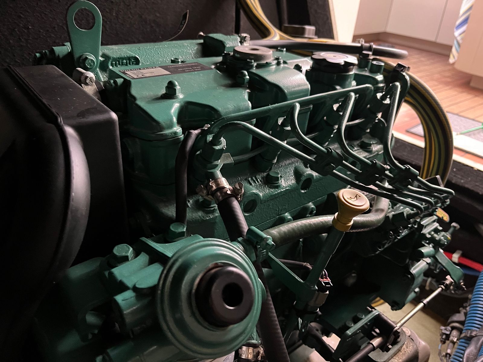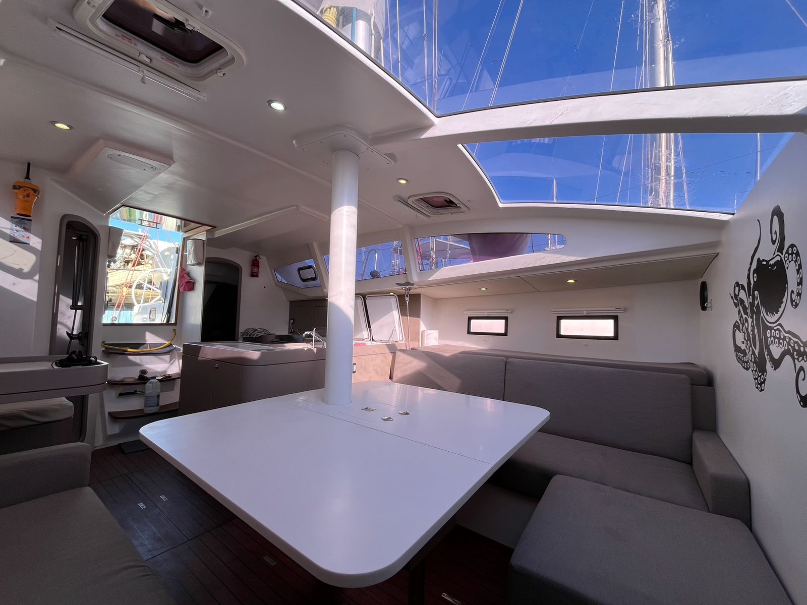 O conforto e a autonomia ficam assegurados com aquecimento Webasto, hidrogerador Watt & Sea 600, painéis solares no pórtico e gerador por célula de combustível EFOY. Motor Volvo Penta D2-40 (40 hp e 1.420 h) com hélice rebatível; cruzeiro eficiente a cerca de 5,5 nós.