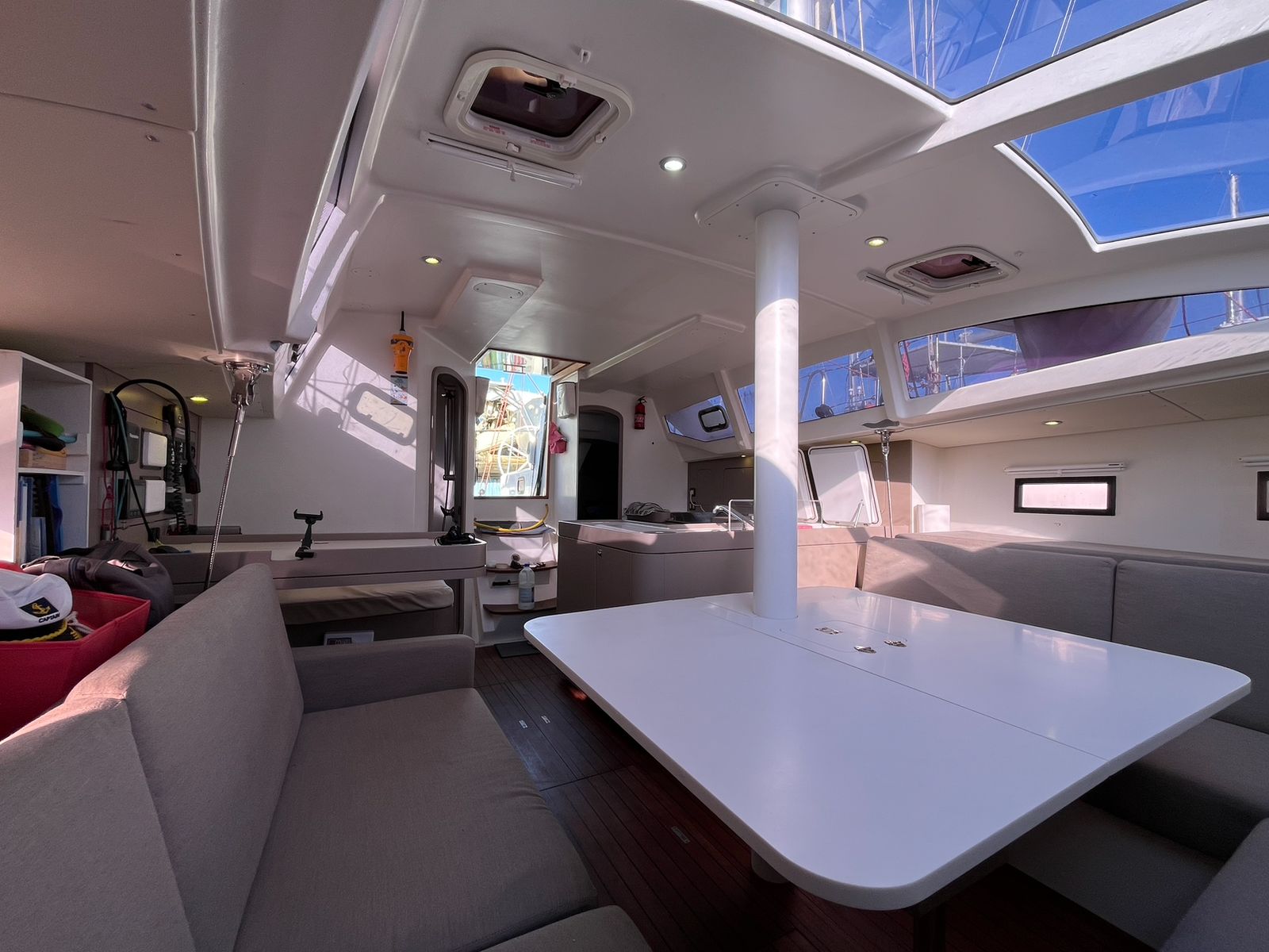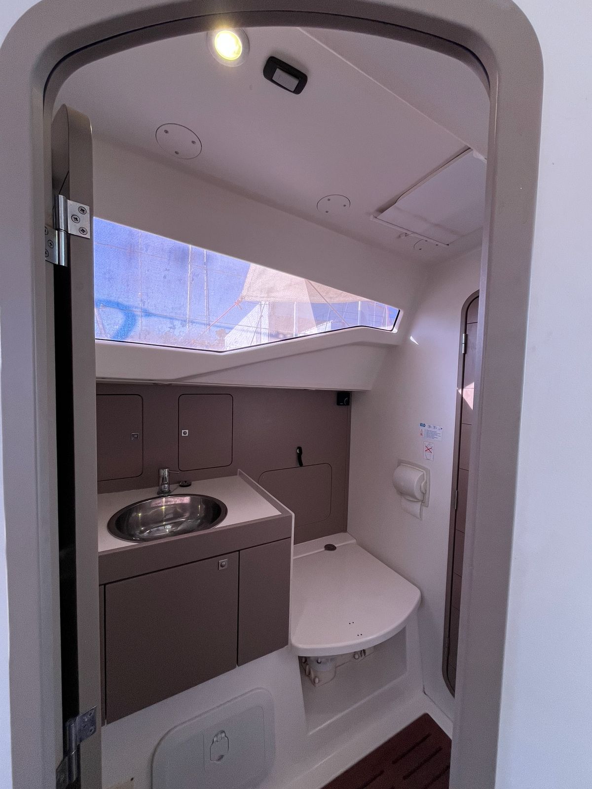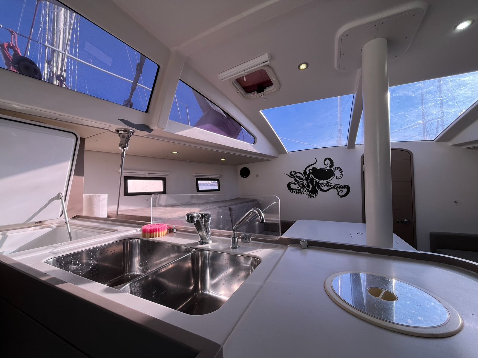 O conforto e a autonomia ficam assegurados com aquecimento Webasto, hidrogerador Watt & Sea 600, painéis solares no pórtico e gerador por célula de combustível EFOY. Motor Volvo Penta D2-40 (40 hp e 1.420 h) com hélice rebatível; cruzeiro eficiente a cerca de 5,5 nós.